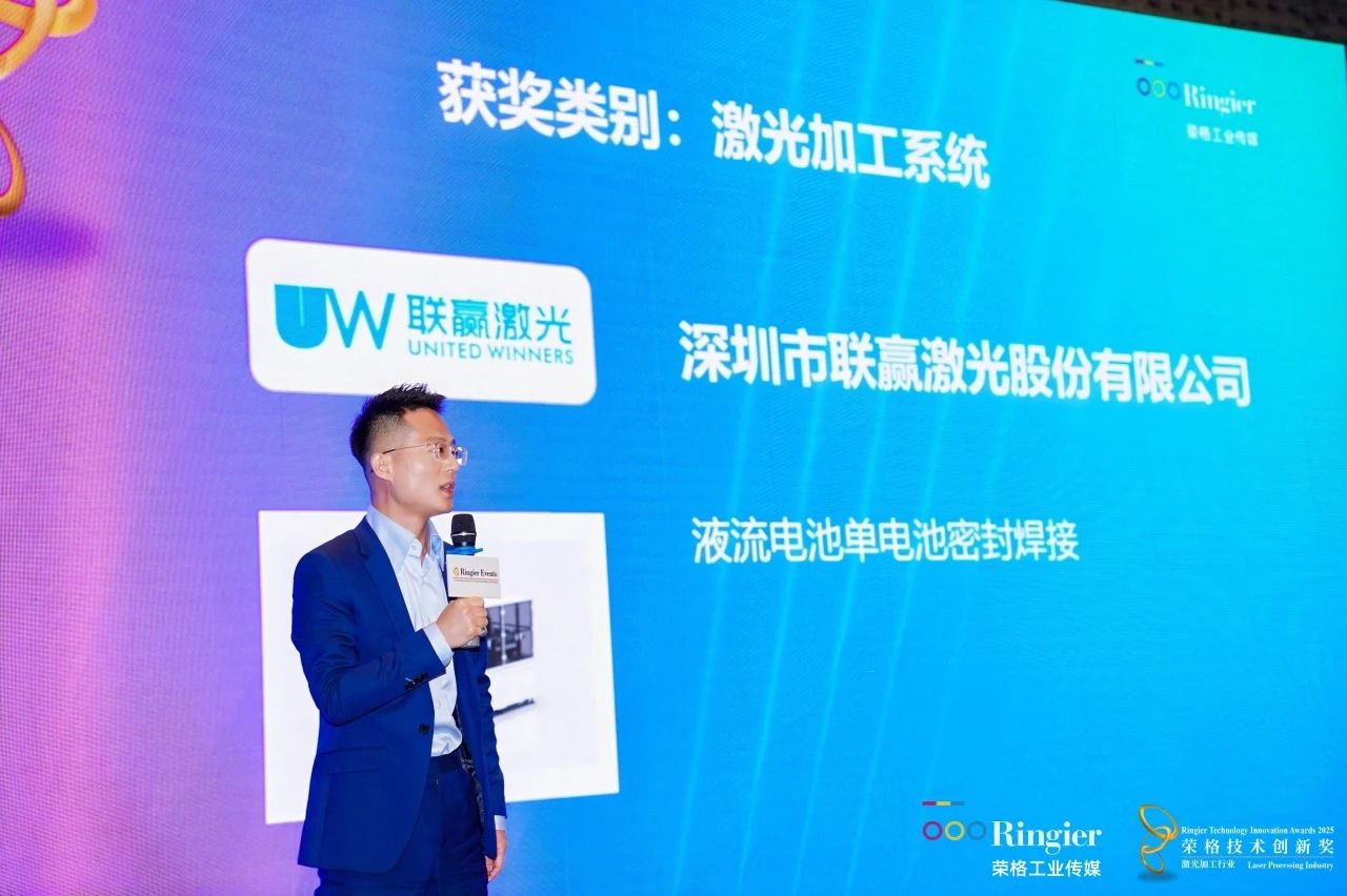 In the selection of innovative products, the sealing and welding of single cells in flow batteries independently developed by UW Laser stood out from numerous candidates and once again won the "2025 Laser Processing Industry-Ringier Industry Innovation Award". This achievement stems from the technological breakthrough of applying laser welding as a sealing method for flow batteries. Mr. Ma Jiajun, Manager of the Flow Battery Industry Department of General Automation Division, represented the company at the conference and received the award on stage.